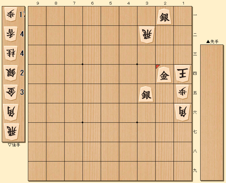 ▲2二銀 △同飛 ▲1四歩 △同玉 ▲3二角成 △同飛 ▲2四金 までの七手詰め 初手▲2二銀 と玉のナナメ後ろから銀を打つ手が正解。 これを、△同玉 と取る手は、▲3二角成 △1三玉 ▲1二金 で詰みますが早詰め。 正しい応手は、△同飛 で、▲1四歩 と玉頭から歩を打って王手をします。 △同玉 と歩を取りますが、▲3二角成 と継続し、 以下、△同飛 に、▲2四金 と腹金を打って詰み上がりです。 |