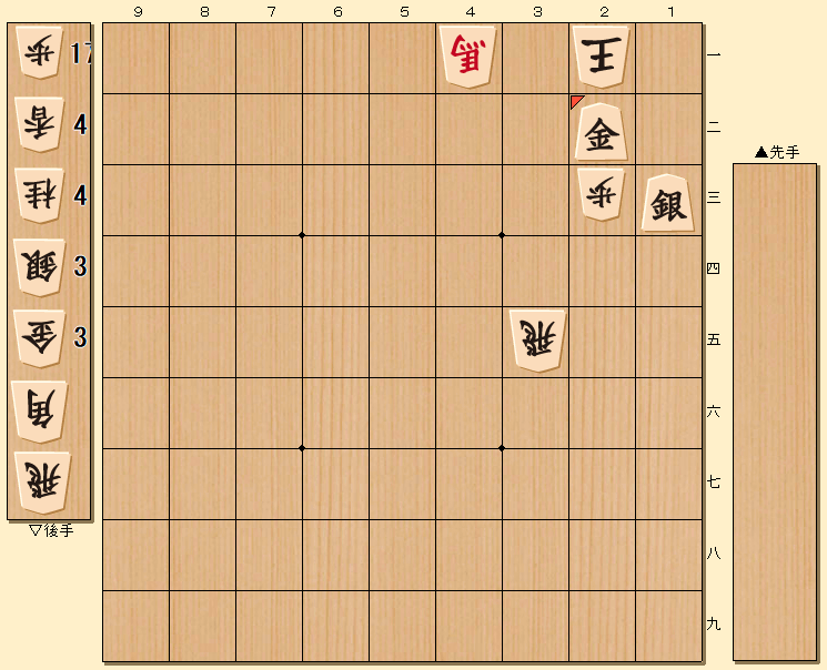 ▲1三銀 △3一玉 ▲2一金 △同玉 ▲4一龍 △同馬 ▲2二金 までの七手詰め 初手▲1三銀 と玉の肩口から銀を打つ手が正解。 △3一玉 と逃げますが、▲2一金 と玉の腹に金を寄せて王手をします。 △同玉 に、▲4一龍 と龍を入って継続し、 △同馬 なら ▲2二金 と頭金を打って詰み上がりです。 6手目、合い駒で受ける手も、▲1二金 で詰みですが、捨て駒は取るのが、詰将棋のエチケットです。 |